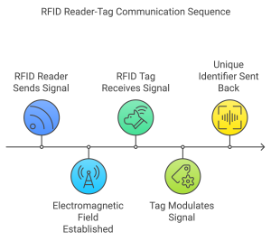 The communication between the RFID reader and the tag occurs through electromagnetic fields. The reader sends a signal, and the tag responds by modulating that signal with its unique identifier.
